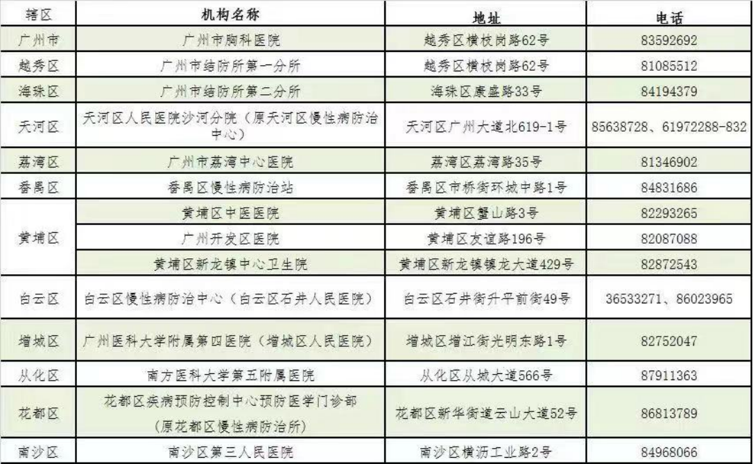 广州市结核病定点医疗机构一览表