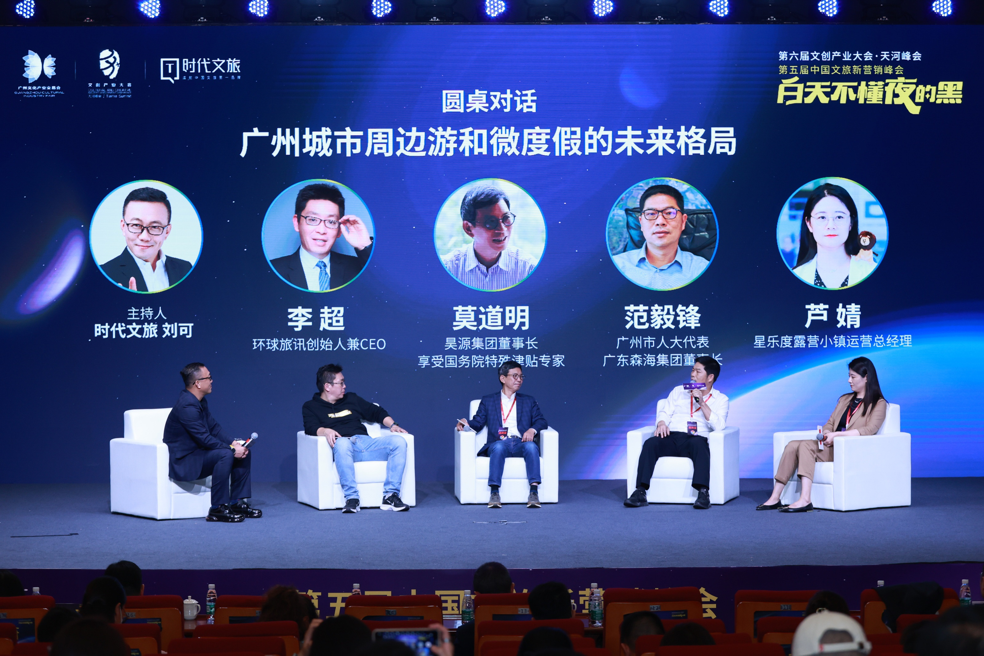 峰会分享环节的最后,嘉宾围绕《广州城市周边游和微度假的未来格局》进行的圆桌对话,环球旅讯创始人李超、昊源集团董事长莫道明、森林海集团董事长范毅锋、星乐度露营小镇运营总经理芦婧以及时代文旅副总裁刘可参与本次论坛。关于周边微度假的未来发展和方向,嘉宾们指出,在未来,更分众的旅游市场一定会是趋势,尤其是随着人们生活水平的提高和高质量度假的需求,城市周边游产品会变得更加细分,个性化更强。