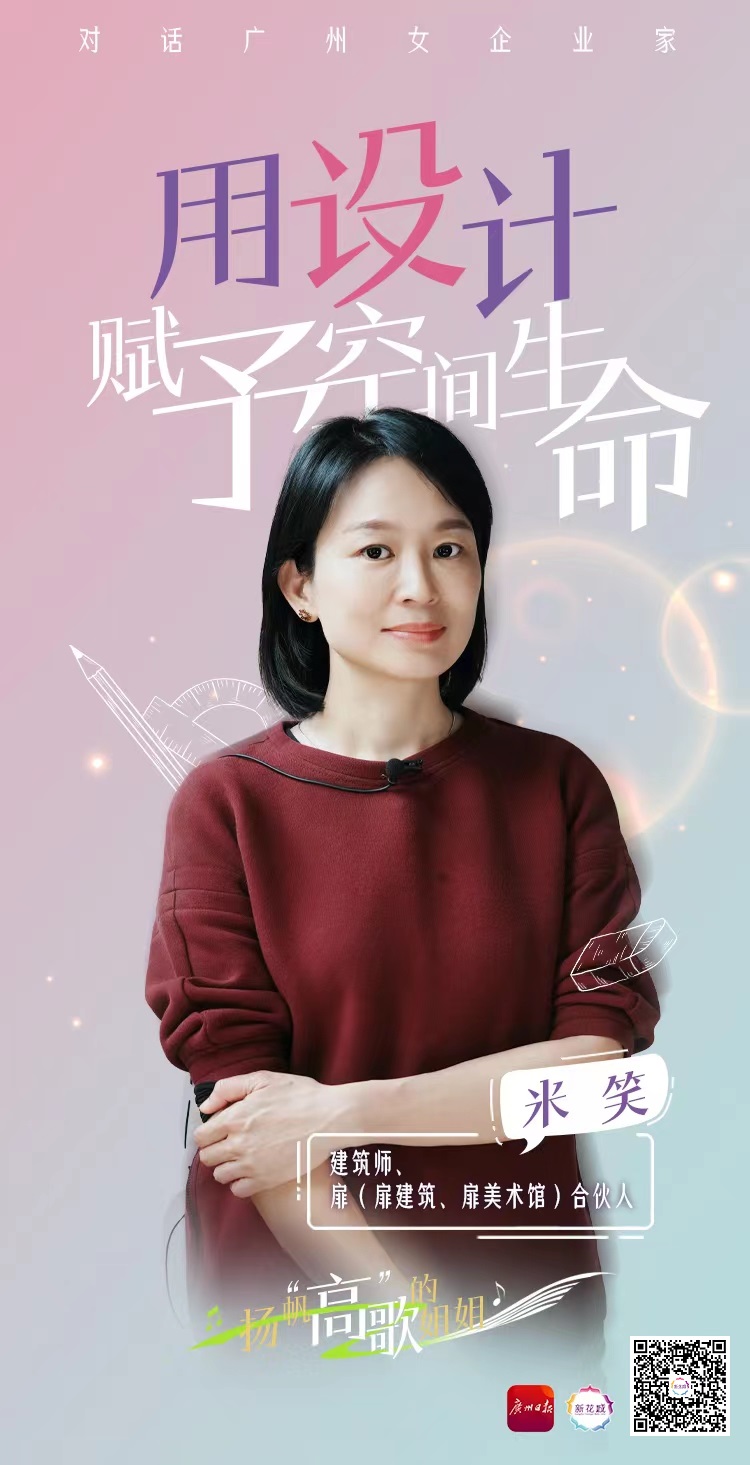 米笑从事建筑行业多年,2006年,她组建了自己的建筑设计团队扉建筑,2007年创办了扉美术馆。如今,前者是为广州带来最多文艺地标的本土建筑事务所;后者是华南地区开馆历史最长的公益民营美术馆。米笑设计的建筑强调在地性和无界性。她喜欢接触和挑战新的东西,凭一股不怕输的劲儿在建筑行业闯出一片天地。谈及经验,她说到自己的柔软法则——一是灵活找位置;二是在坚持之余保有回旋余地。
