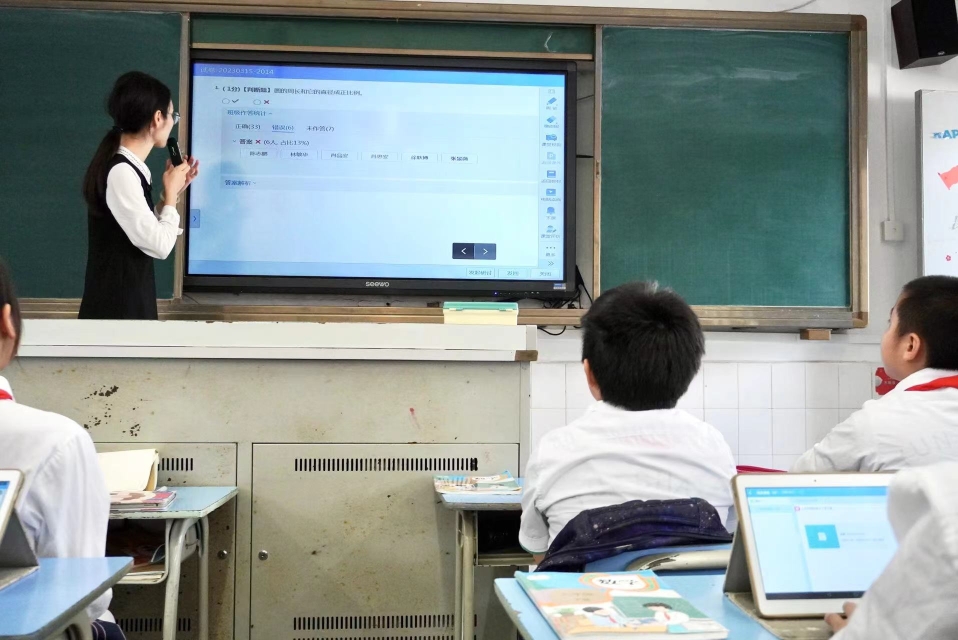 学生用智能纸笔写作文数学课上,老师随机推送题目,同学们即时用平板答题,老师可以在大屏幕上看到总体的正答率和每位同学的选项,根据答题情况,解答学生疑惑。