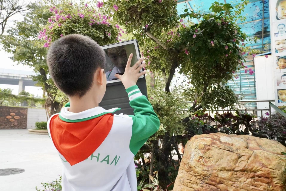 上课铃响了,校园的草丛旁却闪现同学们的身影,人手一台平板,对着校园中的花草“咔嚓”拍照。