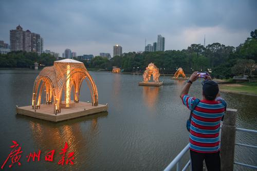 图为在麓湖公园展出的竹艺展作品晚上亮灯,吸引了不少市民打卡拍照。