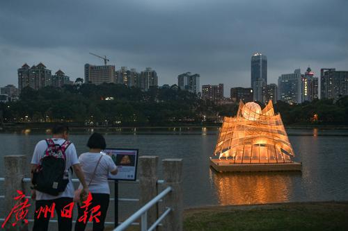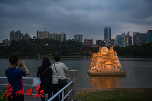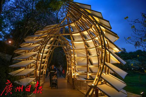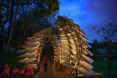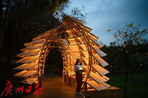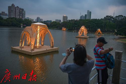 图为在麓湖公园展出的竹艺展作品晚上亮灯,吸引了不少市民打卡拍。