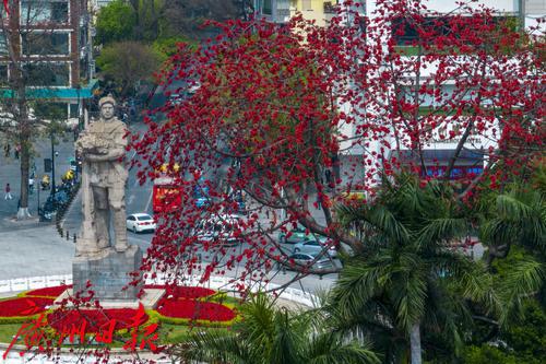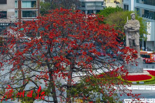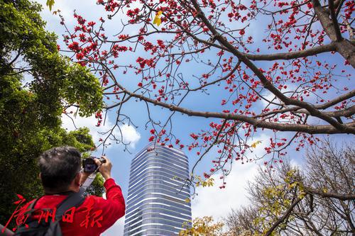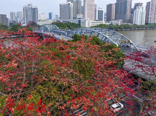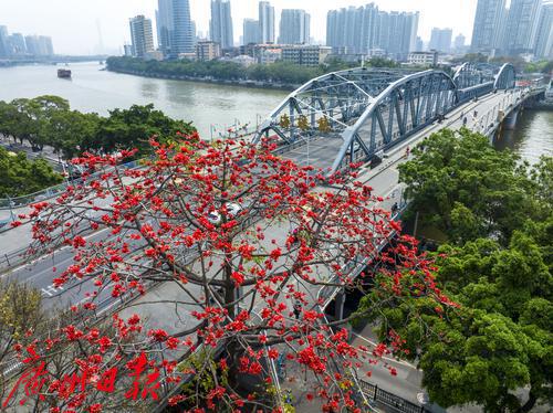 春天的广州,繁花盛放,五彩缤纷,其中要数红色最为抢眼,因为火红的木棉花是广州的市花,英雄花开英雄城,木棉枝头那繁星般的红花,成了广州街头亮丽的风景线。海珠桥南北两岸红棉盛放,每年都吸引不少市民和摄影爱好者拍摄,成为拍摄红棉的打卡点。