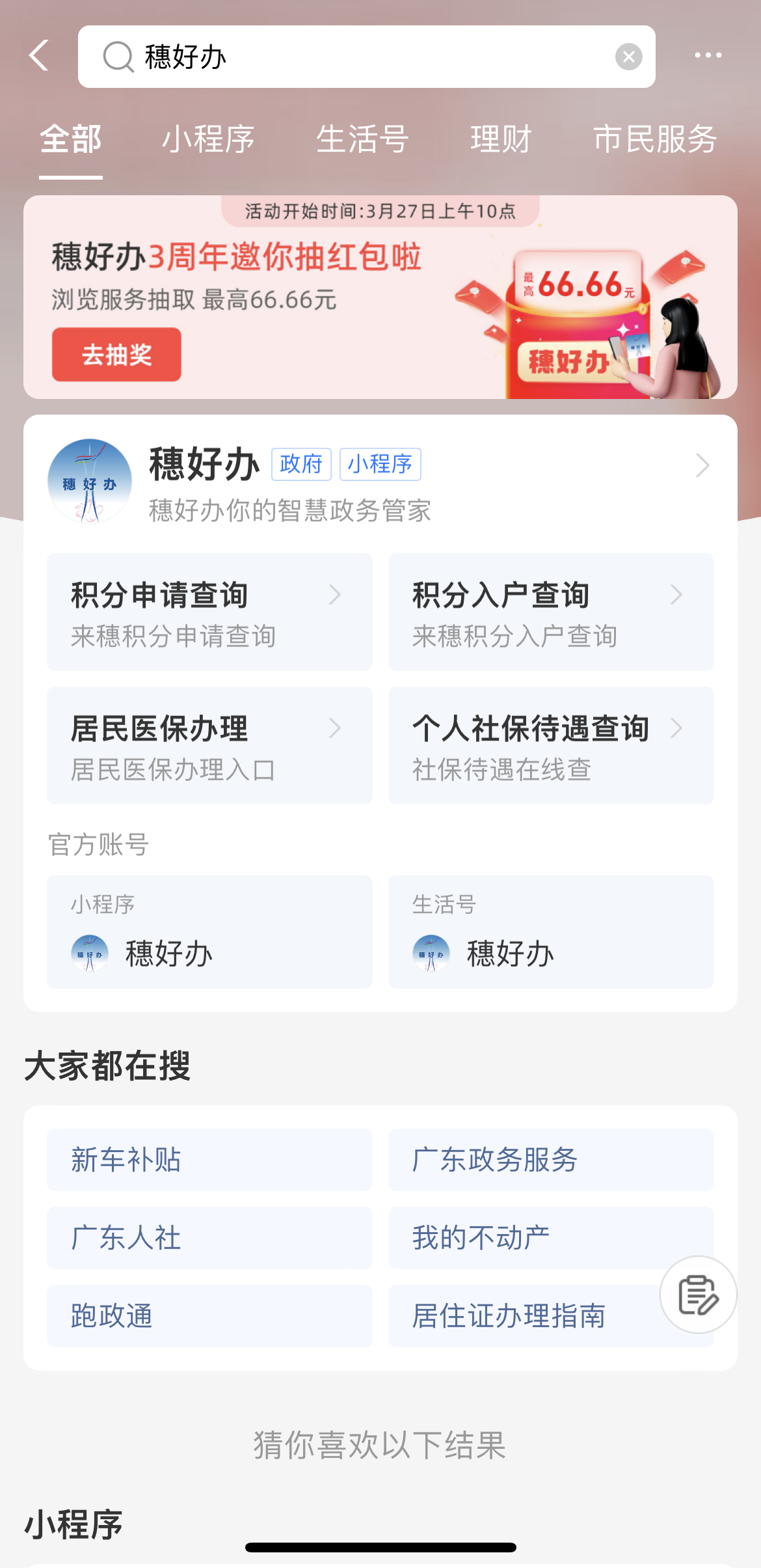 步骤:1、打开支付宝APP,在首页顶部搜索框输入“穗好办”,点击“去抽奖”,完成浏览任务即可抽取红包。