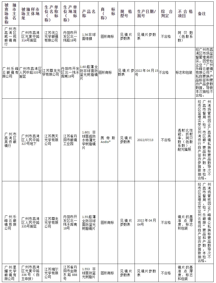 根据公告,不合格产品标称生产单位涉及“广州乐峰云眼镜有限公司”“广州市荔湾区英侨眼镜行”“广州市荔湾区威一视眼镜商行”“广州星耀光学眼镜有限公司”。