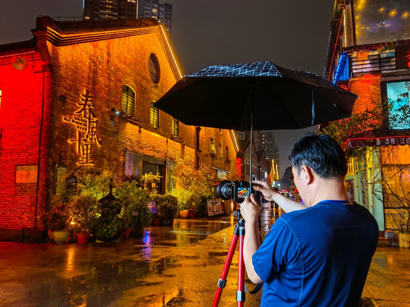一手撐着傘、一手舉着連着相機的三腳架,梭巡在倉庫之間的攝影家們很好辨認。有時相互碰到面,他們還會交流一下拍攝點心得。「這裏的倉庫保存得很好,燈光也很好地勾勒出建築的線條。尤其因為下雨,建築的光影倒映在『天空之鏡』上,非常美。」香港元朗大會堂長青攝影學社社長梁惠波說。