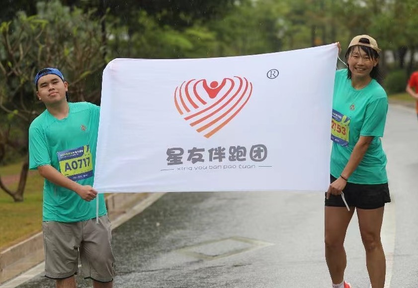 “比赛那天的大雨,对于心青年和普通跑者来说,都是体力和耐力上的考验。”小丽是宇琦的陪跑志愿者,陪伴他度过了漫长的2小时48分钟。一开始,雨还不大,小丽一路控制他保持匀速,提醒他适时补充水分,边为他拍照鼓劲,一切都很顺利。雨逐渐大了起来,大家艰难前行。在最后两公里的时候,宇琦因为太累,开始有了情绪。“当时我判断他的体力和身体是没有问题的,就不断通过语言鼓励他完赛。”她告诉宇琦,已经坚持了19公里,很快到达终点,“我跟他说,团队的旗子就在我手里,只要我们跑完,就可以在终点展示它,他可以完美压轴。”荣誉感给了他支持,他很快调整自己的情绪,继续坚持下去。