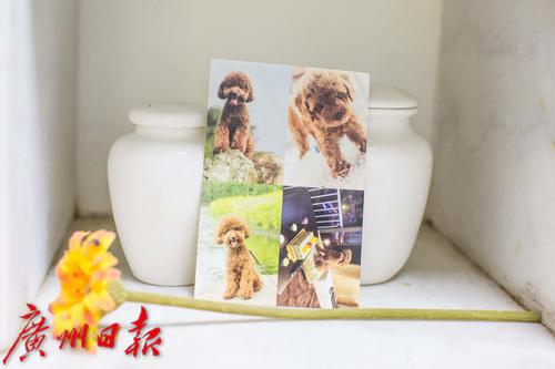 骨灰盒前摆着小狗生前的相片,代表着主人无尽的思念。