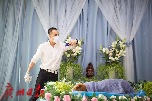 宠物殡葬师为刚刚去世的狗狗布置告别灵堂。