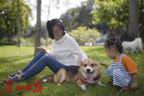 二沙岛,小朋友在草地上和一只柯基亲密地玩耍。