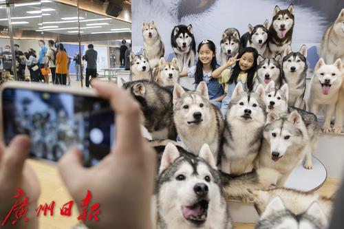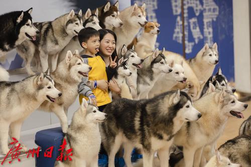 3月25日,黄沙一家哈士奇主题宠物店,家长和孩子们正在和哈士奇们亲密合影。