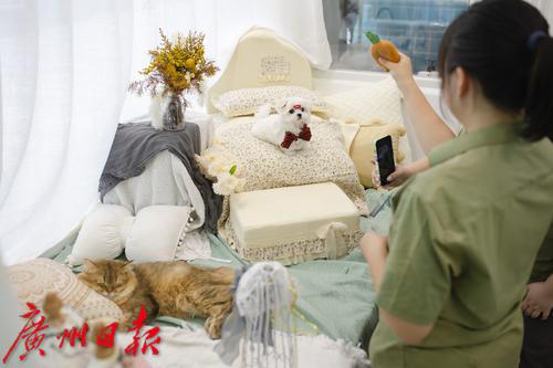 海珠区觅伴宠物店内,工作人员为盛装打扮的小狗拍摄宠物写真。