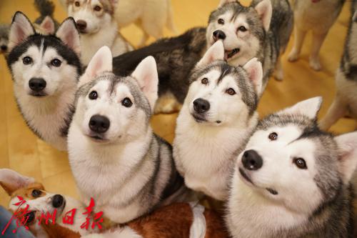 3月25日,黄沙一家哈士奇主题宠物店,哈士奇们聚精会神地看向镜头。