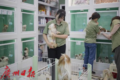 海珠区觅伴宠物店内,工作人员细心呵护着店内的宠物们。