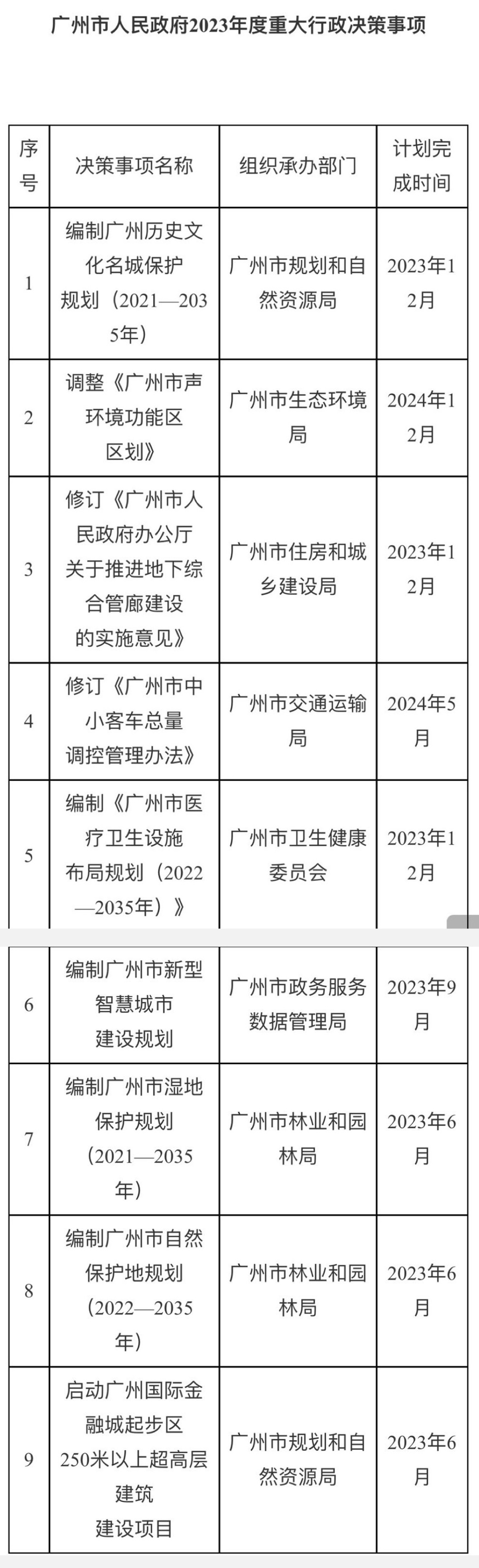 根据去年10月1日起实施的《广州市重大行政决策程序规定》,广州市重大行政决策事项要以可视化的方式向社会公布,接受各方监督;以目录化的形式,加强对各项决策事项的管理。此次同重大决策事项一起公布的,还有各事项的组织承办部门、计划完成时间。同时,根据要求,相关部门需要按照规定认真组织实施,并落实好公众参与、专家论证、风险评估、合法性审查、集体讨论决定等决策程序。
