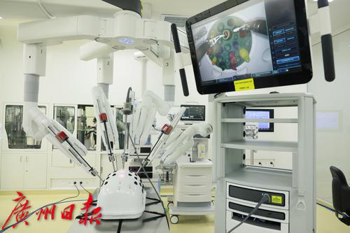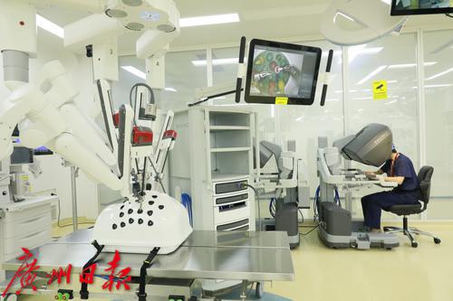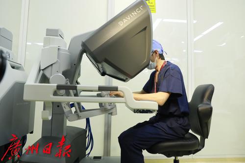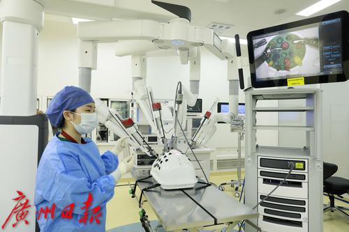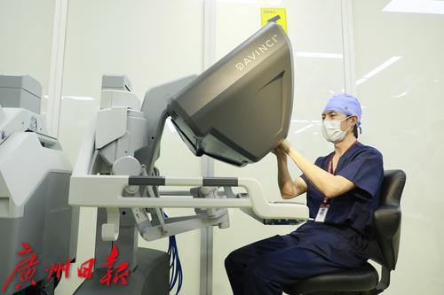 中山大学附属第一医院泌尿外科副主任、南沙院区泌尿外科执行主任吴荣佩演示第四代达芬奇手术机器人的工作状态