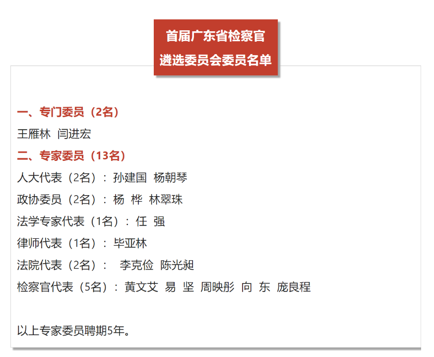 3月28日,广东省检察官遴选委员会成立大会暨第一次全体会议在广州举行。会议推选广东省检察院副检察长王雁林为首届广东省检察官遴选委员会主任委员,黄文艾、闫进宏、李克俭为副主任委员。