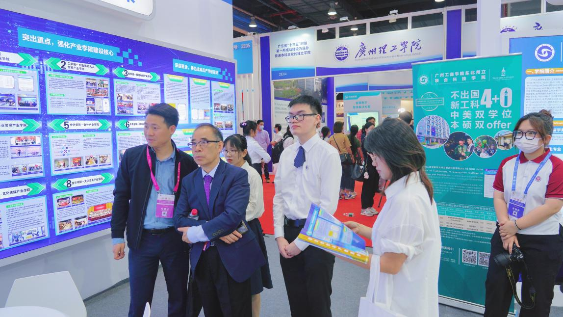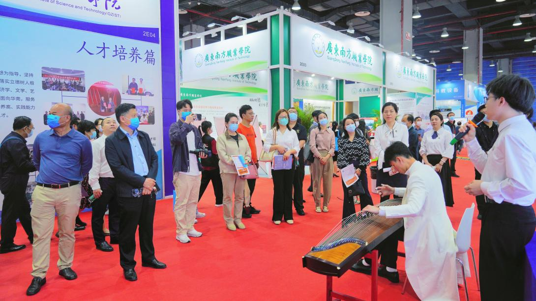 在博览会上,广州工商学院的布展以学校“工商蓝”为主色调,穿插运用了数字化媒体展示功能。现场除展板介绍,还设有VR眼镜、多媒体电子屏幕、古筝表演等,多维展示学校的办学特点和党建思政、教学科研、校企合作及产教融合等成果,吸引主办方代表、众多同行和观众驻足参观、体验和交流。现场参与双语讲解、仪器展示、摄影摄像、古筝表演等工作的学生达20余名。来自该校外语学院大三商务英语专业的古佳浩同学说:“通过参加这次博览会,积累了实践经验,为将来走上工作岗位、服务社会奠定了基础。”