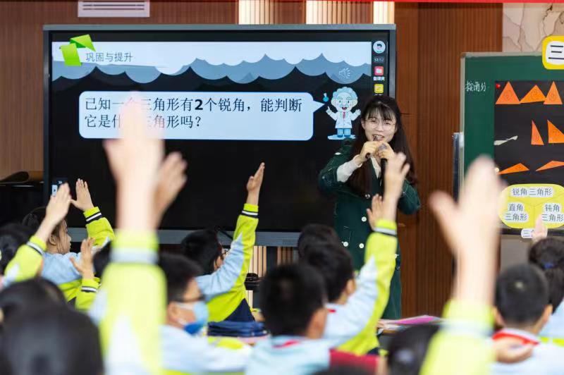 在陈露研老师的《三角形的分类》一课中,陈老师借助“智能学伴”答题机器,使用其检测、评价、抢答、拍照等功能,和四年级3班的同学们上了一节高效、有趣的数学课。首先,学生答题的数据得以及时统计、反馈,教师能迅速了解到学生的学习情况,调整教学策略,实施精准教学。其次,在课堂中段,陈老师使用“智能学伴”让学生进行“抢答游戏”。同学们的注意力瞬间被吸引,学习兴趣被激发。此外,陈老师在课堂上,还会持续不断使用“智能学伴”给学生进行点评,学生也实施自评,并汇总成完整数据。