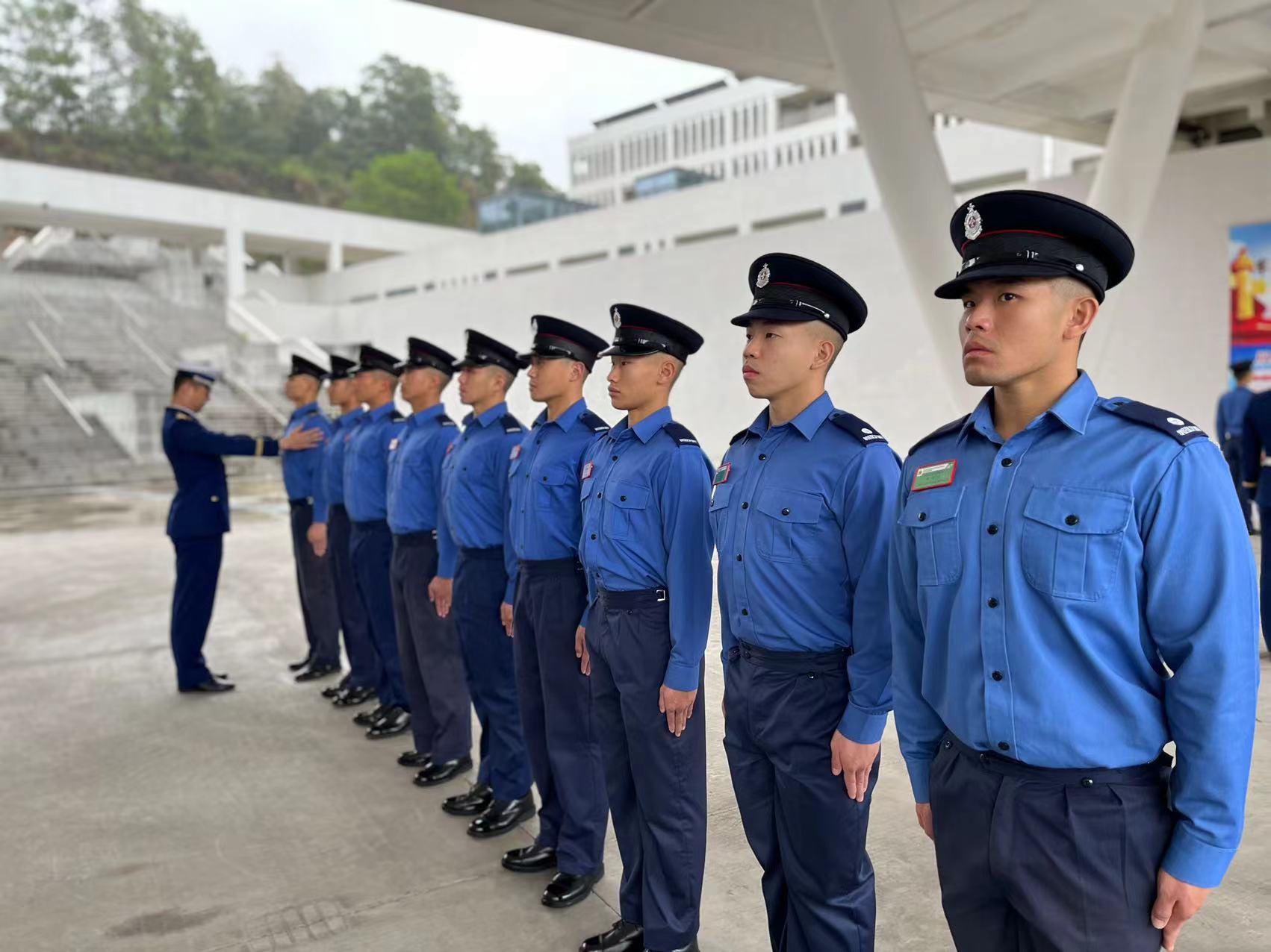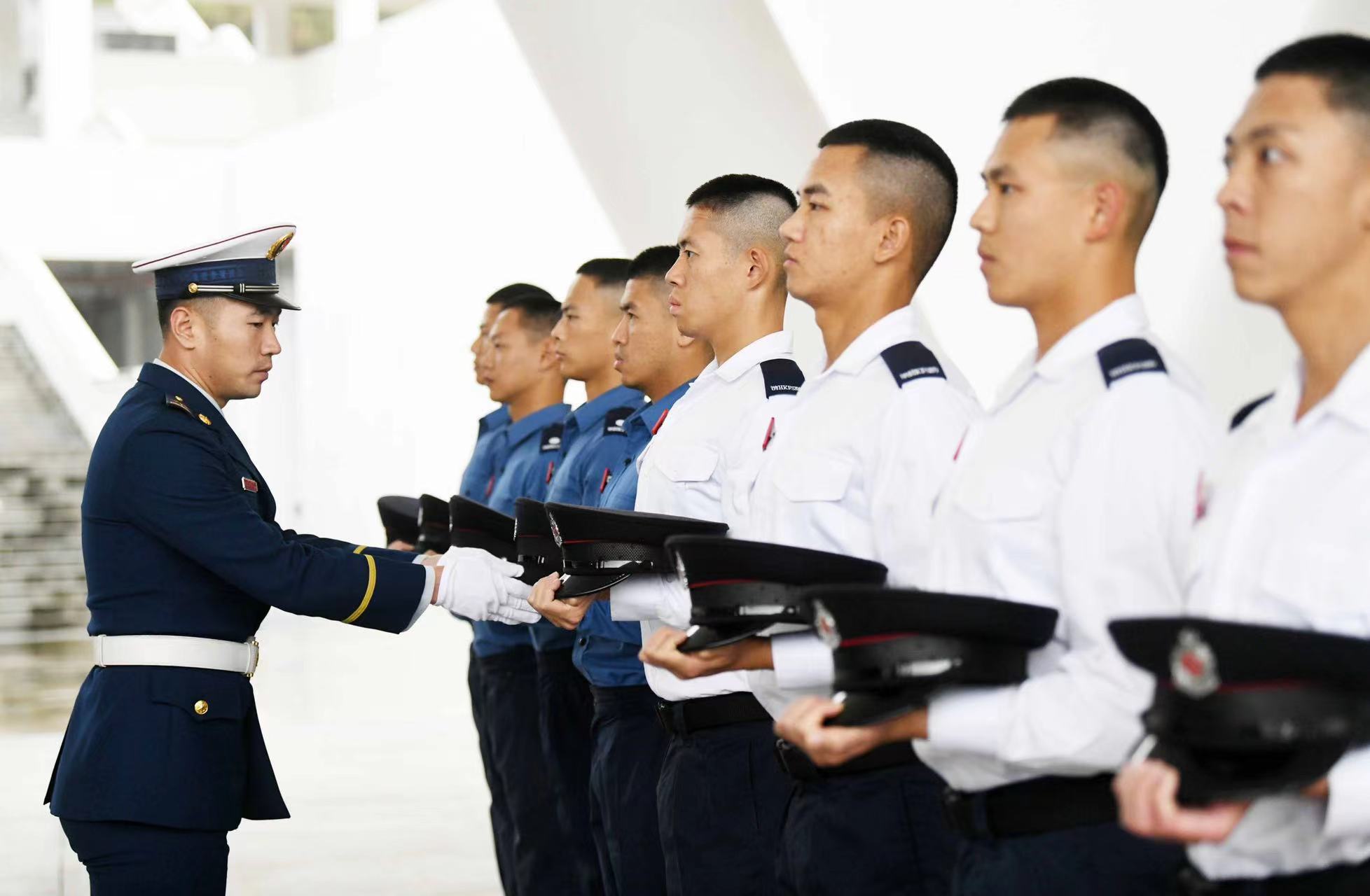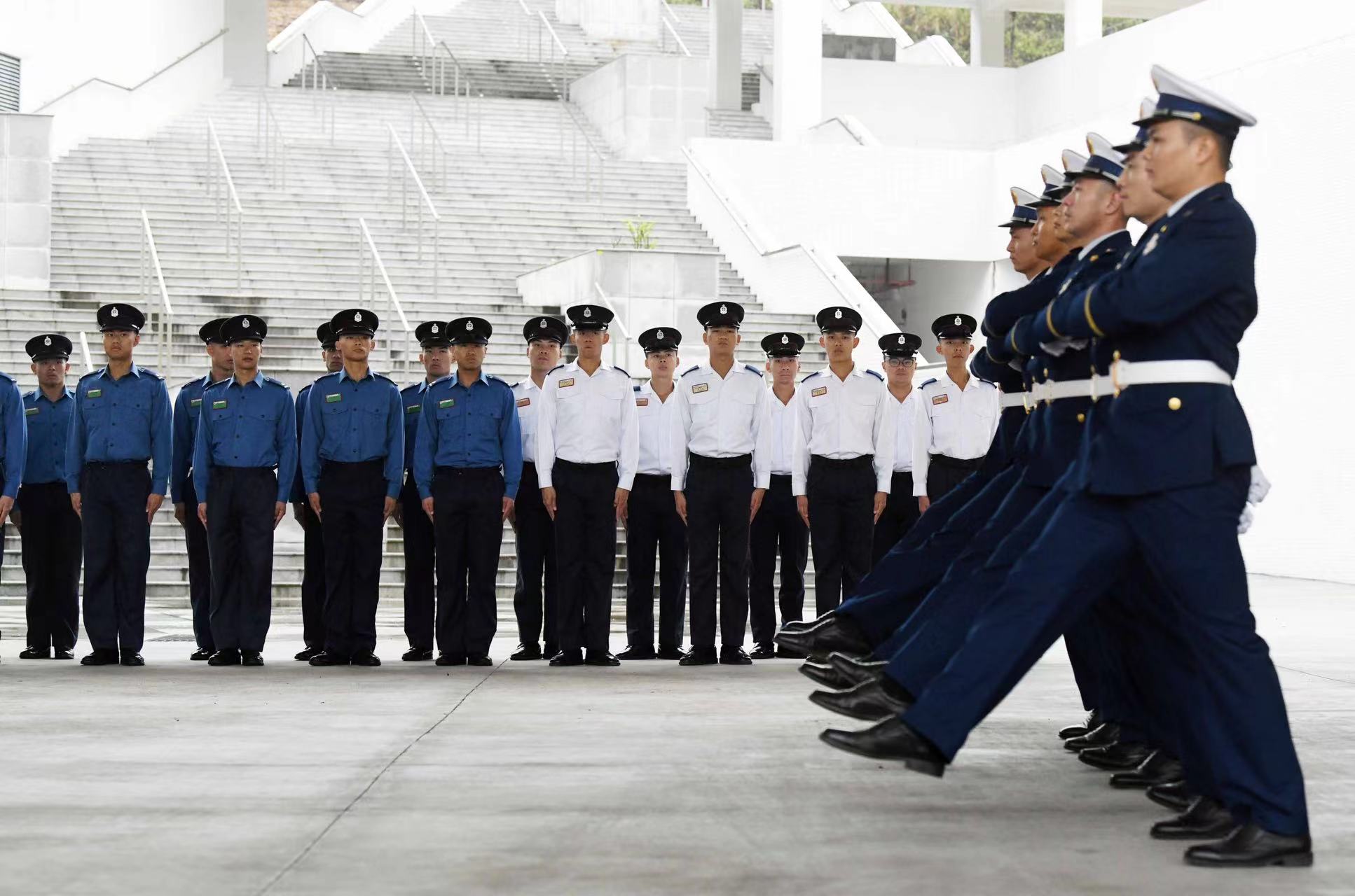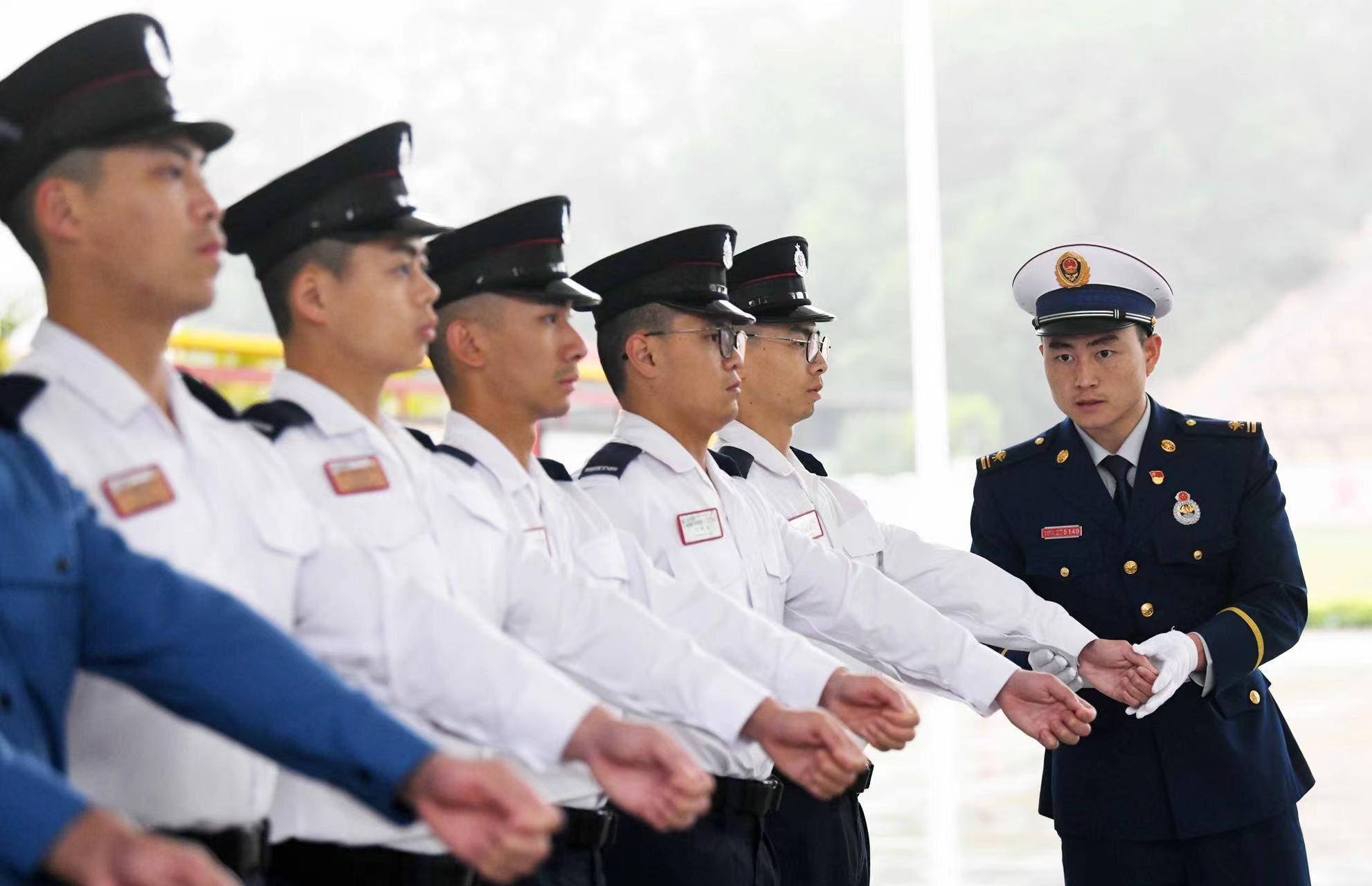 「將帽取下,取捷徑放置於左小臂,帽徽朝前,帽頂朝上,右手迅速放下」「左腳向正前方踢出75厘米,腿要綳直,腳尖下壓」……廣東省消防救援總隊的教官們悉心講授中式隊列步操的動作要領。香港消防處新入職消防員們個個精神飽滿,嚴摳細節,反覆進行着隊列訓練,場地上空回蕩着鏗鏘有力的踏地聲。