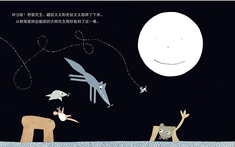 这是一本讲述老鼠和朋友们如何吃月亮的故事。老鼠太太吃完所有的东西,还是觉得饿得慌。这时,她恰好看到了一轮明月高高挂,既像奶酪,又像烧饼,看起来好好吃的样子。于是,她决定爬高高去吃月亮。可是,她太矮了,怎么办呢?她和朋友鼹鼠太太开始叠罗汉架肉梯,可是蚊子飞来了,狠狠地叮了鼹鼠一口,结果她们都摔了下来。她们不泄气,邀请了野狼先生和大熊先生来帮忙。但是,那只讨厌的蚊子又来了,总是在他们快够到月亮的时候咬上一口。这时,救星蜘蛛小姐驾到,只见她把蛛丝拴在了月亮上,所有动物都顺着蛛丝爬到月亮上大吃一顿。而蚊子想咬蜘蛛小姐的时候,被蜘蛛小姐一口吃掉了。