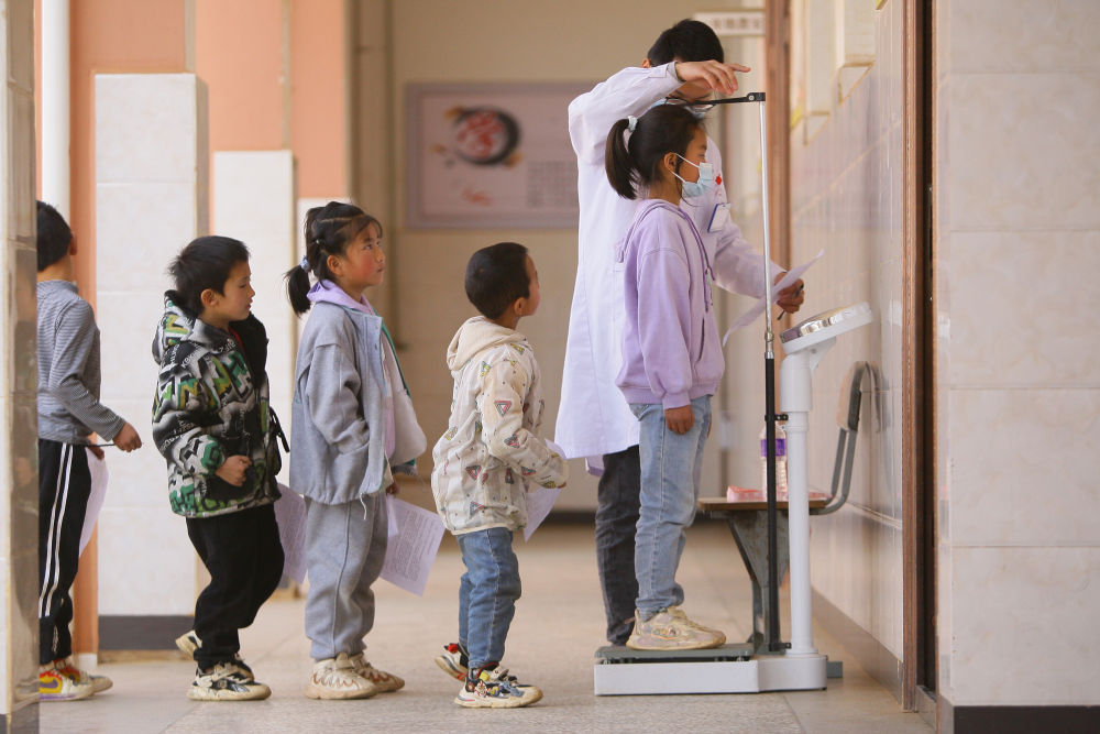 3月14日,在曲靖市沾益区白水镇岗路小学,医护人员为学生测量身高体重。新华社发(杨俊鹏摄)