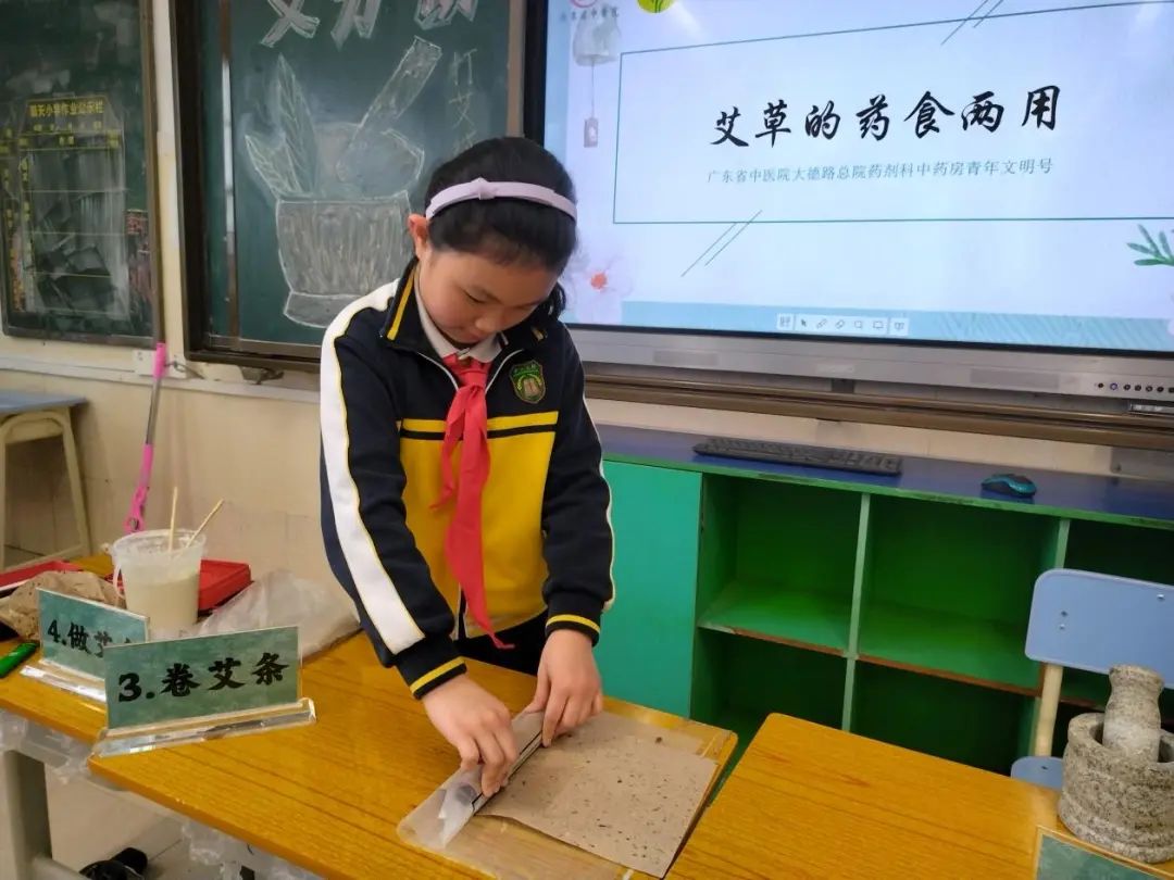 活动当天,来自广东省中医院的医生团队还以《艾草的药食两用》为题,向学生科普了艾草在温经止血、散寒止痛等方面的功效。“我觉得做艾条很好玩、很有趣,通过这节课的学习我还知道了艾草有哪些功效和作用。”月涵同学说道。该班的玥霖同学告诉记者,自己不仅学习了艾条的制作方法,还学会了如何做艾灸,“医生老师教我们做艾灸的方法和注意事项,还告诉我们如何辨别穴位,回家后我也给爸爸妈妈做过艾灸。”