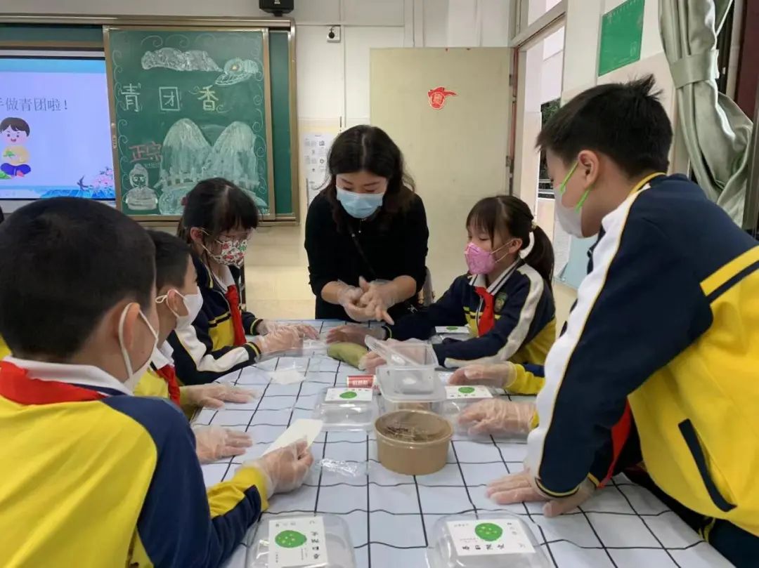 另外一边,艾草的清香正从五年(4)班的教室里传来,原来他们开展了一场“清明食青团”主题活动,大家正热火朝天地动手做青团。