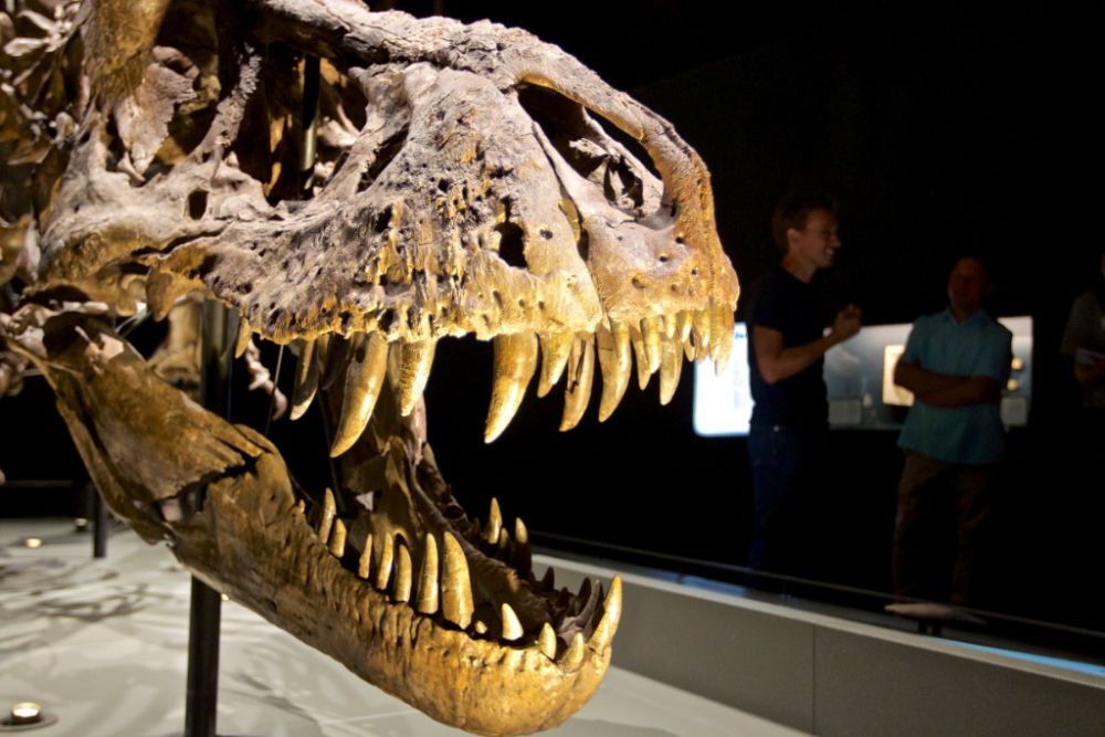 2019年8月27日,在荷兰莱顿,人们在自然生物多样性中心观看展出的霸王龙骨架。新华社发(西尔维娅·莱德勒摄)