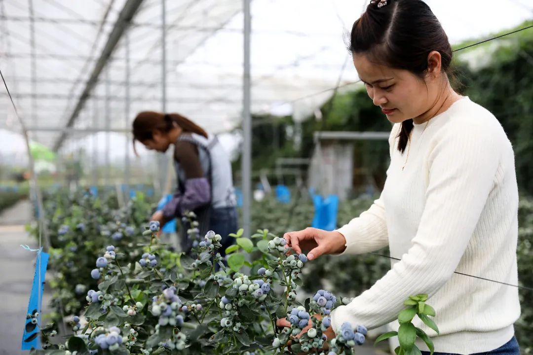 基地培育出来的蓝莓又壮又好吃是有秘诀的。绿天然采用了无土栽培大棚和滴灌种植技术,蓝莓在生长过程中不接触土壤,有效杜绝了重金属和有害微生物的污染。蓝莓基地还为村民提供了在“家门口”就业的机会,目前护理期稳定就业80余人,成熟旺季还会提供更多的季节性就业岗位,让附近村民实现“家门口”就业增收致富,助力乡村振兴。