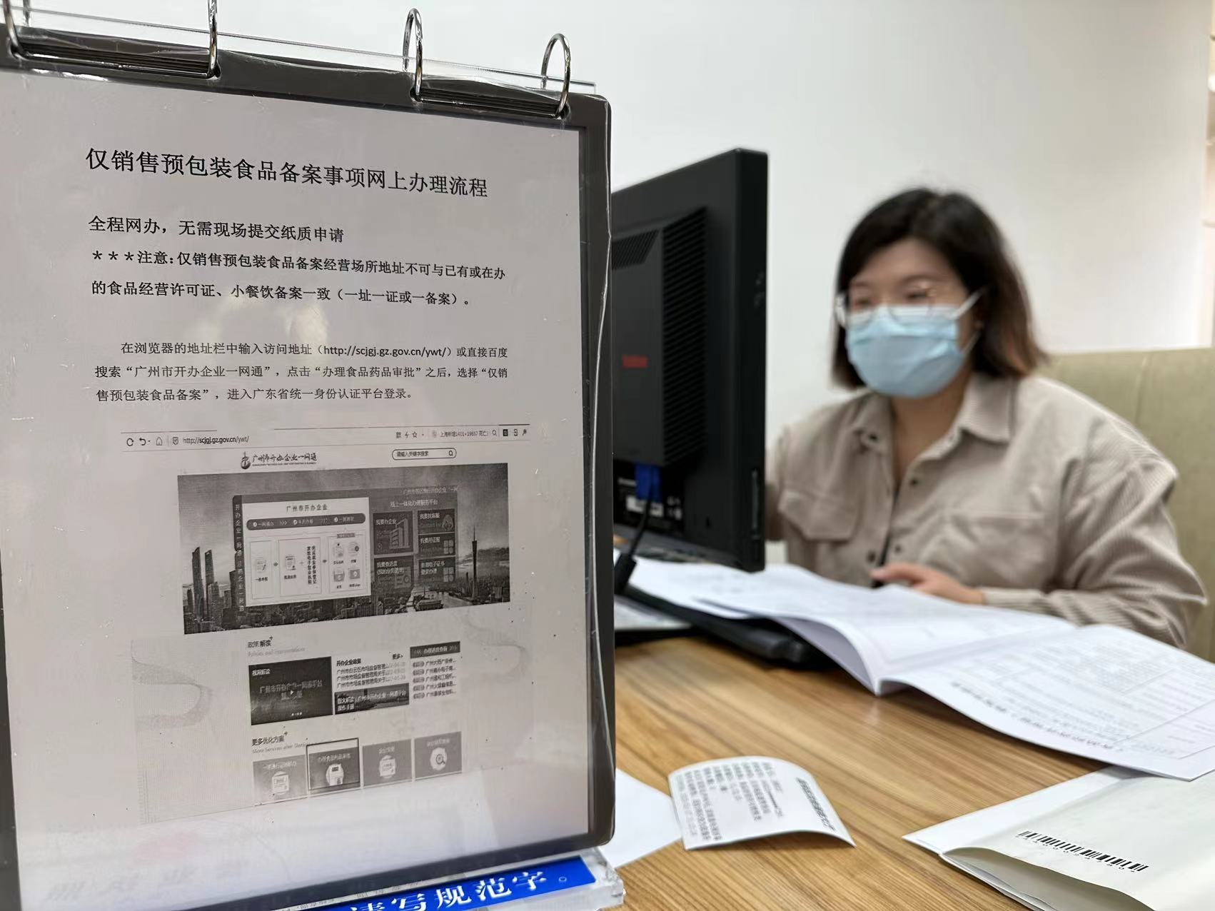 在食药方面的许可业务,虽然越来越多企业选择网办,但也有不少企业习惯线下办理。在3楼的综合业务厅,2个综合窗口可接收食品药品类许可的申请。在递交资料前,市场监管部门提供了预审服务。预审“窗口”其实是一个个开放卡座,办事人与政府工作人员相对而坐,有什么问题可以充分沟通。卡座还有各种指引资料和打印机,缺了什么表格可以马上打印填写。“以前办证要跑好几趟,现在来一次就能搞定,方便好多。”刚成功递交食品经营许可申请资料的王先生说。