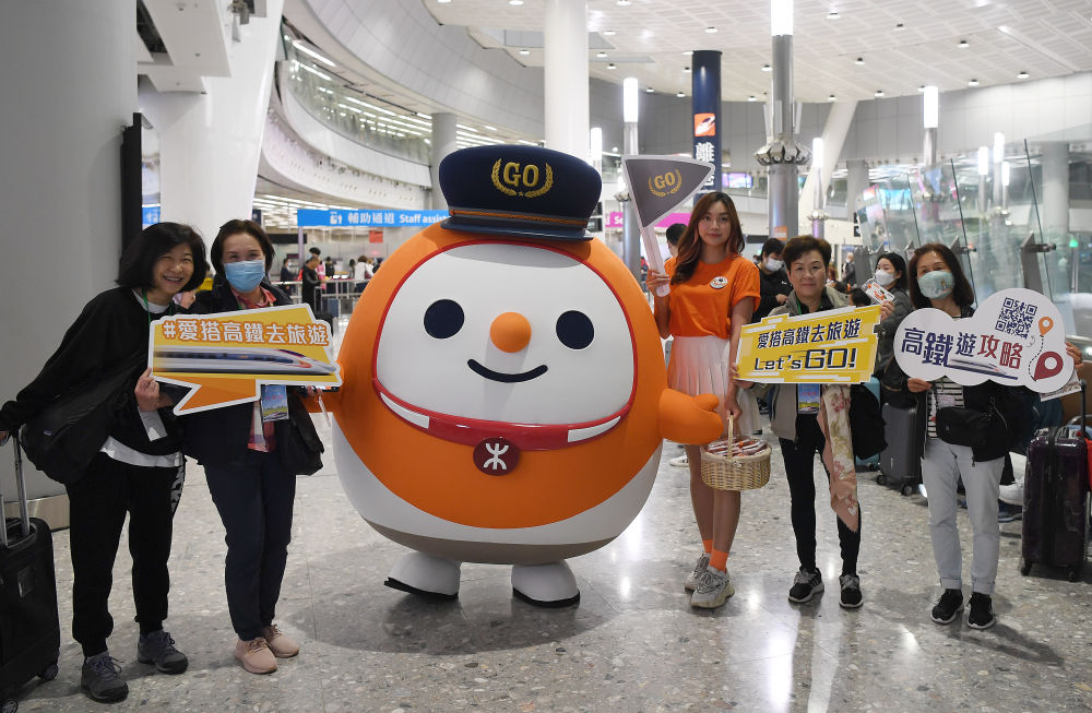 香港高铁西九龙站7点左右已有大批旅客抵达离港大堂。港铁公司于车站内安排高铁吉祥物“高铁队长”到场,不少旅客上前合影,并有工作人员向旅客派发行李牌等纪念品。港铁公司预计当日有超过3万名乘客乘搭高铁前往内地,已经加派超过100名工作人员在场协助,现场整体运作顺畅有序。