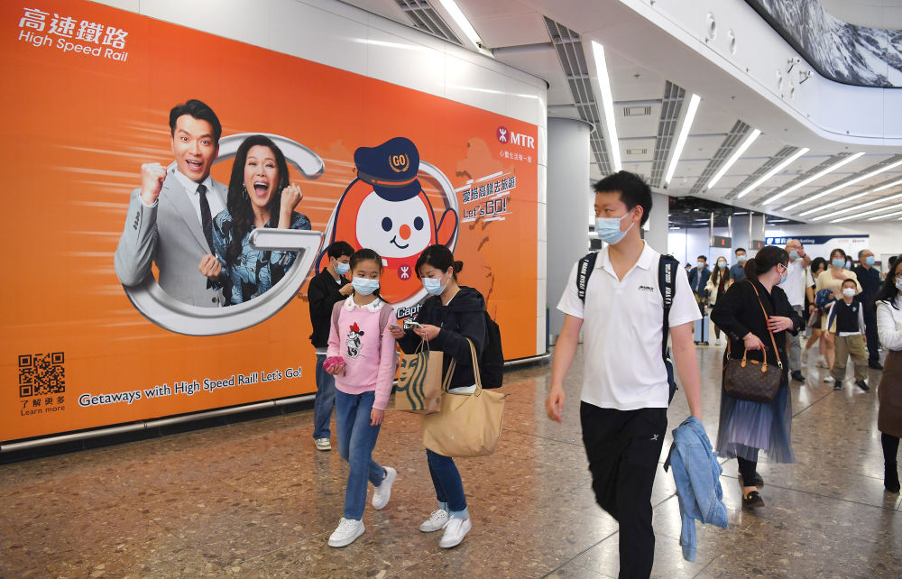 4月1日,从内地搭乘跨省长途列车抵港的旅客走出香港高铁西九龙站。新华社记者陈铎摄