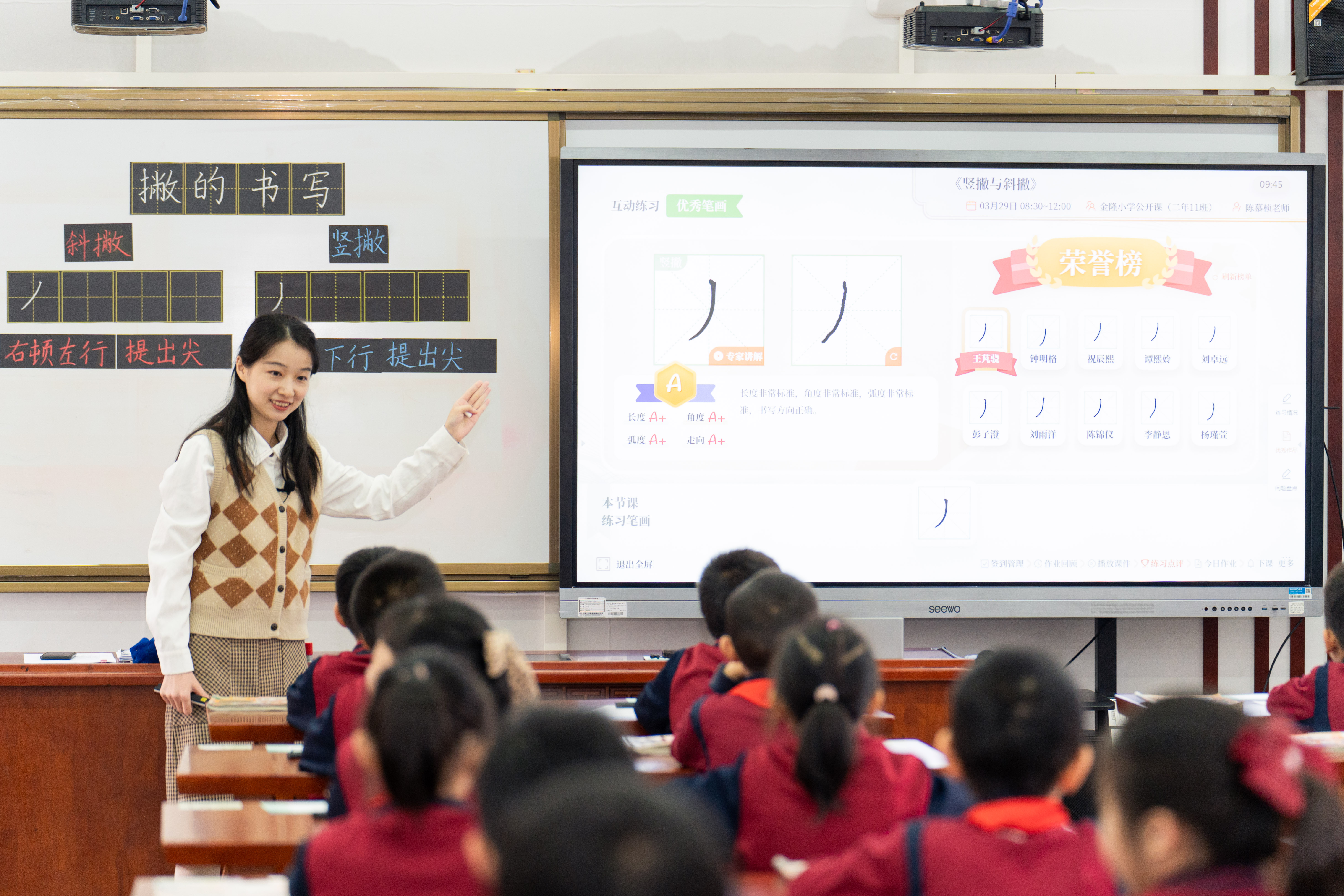 “长度、角度、弧度非常标准,书写方向正确。”系统会对学生笔画书写的长度、角度、弧度、走向等进行评分,大屏上还会展示“荣誉榜”。