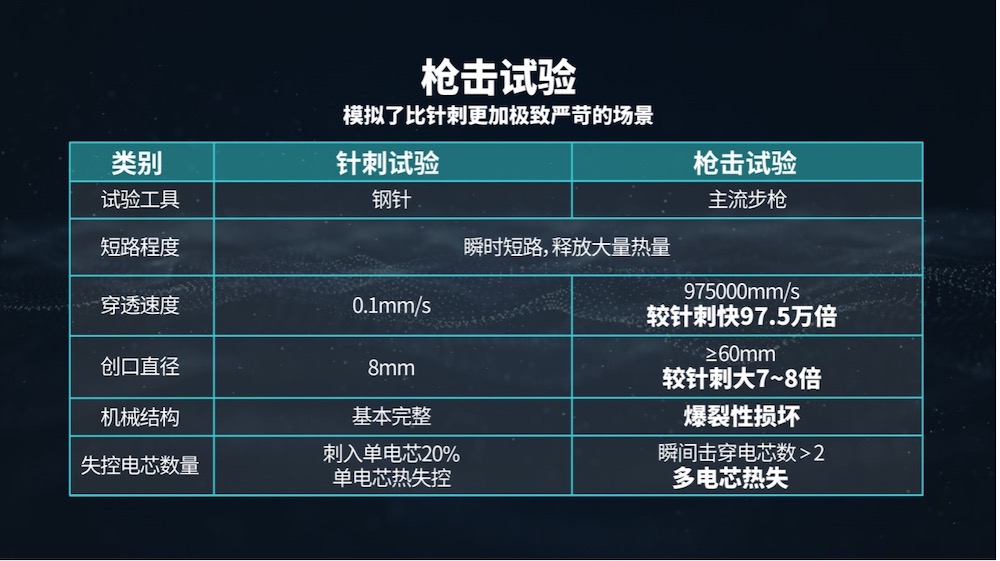 针刺试验和枪击试验都是以“穿刺”方式进行验证,两者不同之处在于:速度。速度增加,试验难度会以指数级倍数增加。当子弹穿透电芯时,速度可达针刺的97.5万倍,创口直径是针刺的7-8倍,可瞬间击穿多个电芯并造成热失控和爆裂性破坏。