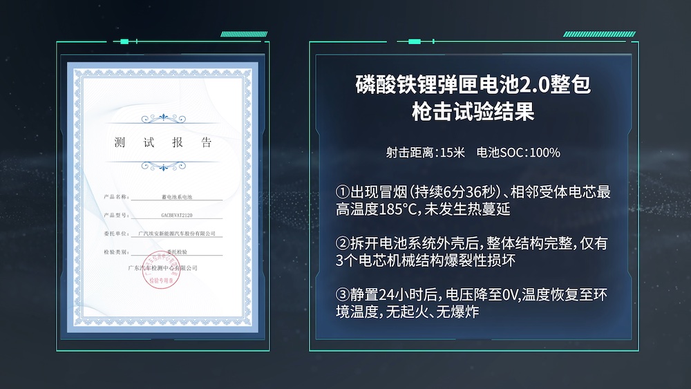 3月30日,埃安举行弹匣电池2.0试验发布会,实现电池整包枪击不起火,解决多电芯瞬时短路、爆裂性破坏等极端环境下的电池安全难题。无论试验难度、完成度、成功率,在全球范围内,都是前所未见。