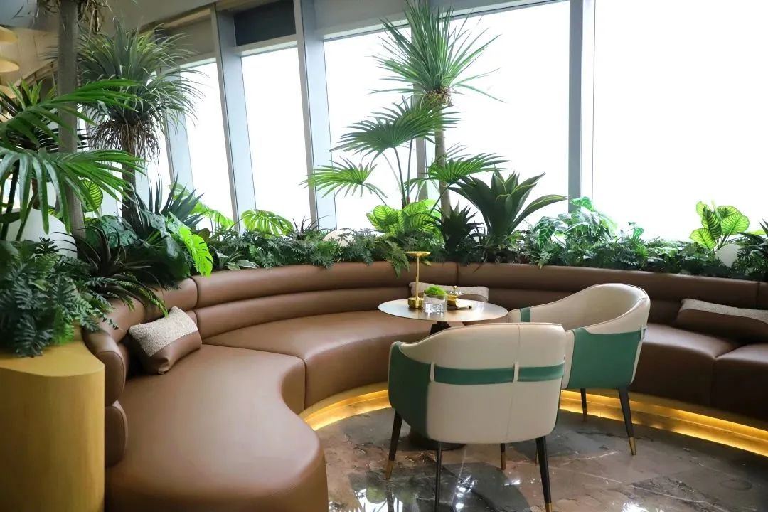 在沙发座椅间点缀的园林植被栩栩如生,空中花园唤醒了视觉感官。在此处阅读,可感受身处花园中被植被包裹般的静谧。
