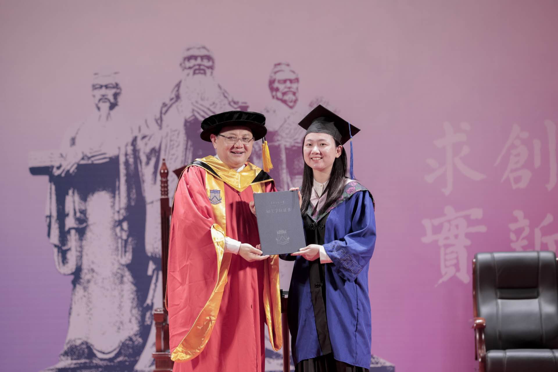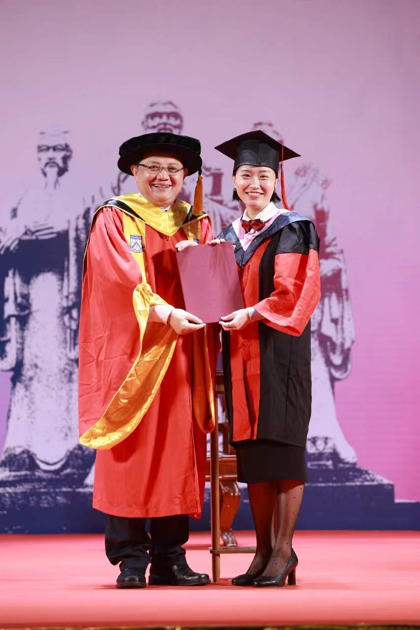 化学学院2020届毕业生胡润泽现在是成都市第七中学的一名教师。为了参加这次学位授予仪式,他特地从成都出发,跨越一千多公里回到广州,奔赴母校。他幸福地表示:“仿佛回到了三年前自己即将本科毕业的时候,那时想成为一名教师的理想如今已经实现,但‘做一名好教师’的路却值得我用一生去践行!”他认为参与此次学位授予仪式,象征着学生向教师身份的真正转变,通过仪式叩问过去,帮助他更好地展望未来。最后,他表示:“感谢学校精心组织,我得以‘穿越时空’,圆那迟到三年的‘毕业典礼之梦’。我将带着母校赋予我的‘精神气质’,教书育人,发光发热!”