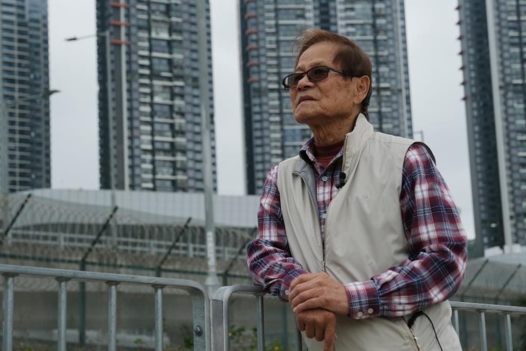 在香港香園圍口岸,85歲的萬秀平站在旅檢大樓前,背後的深圳高層居民樓近在眼前。新華社記者 王申 攝