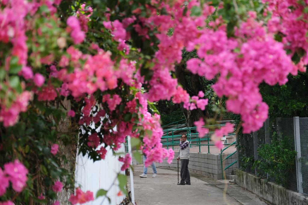在香港香園圍村,85歲的萬秀平走在村裏。新華社記者 王申 攝