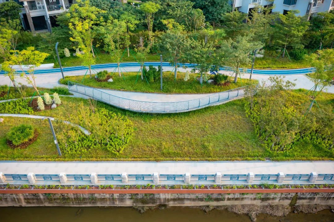 荔城街碧道建设工程融入了海绵城市理念,围绕增城区“山、水、田、湖、城”的空间格局,因地制宜规划建设多重海绵设施,其中雨水花园7764平方米、透水铺装布设95337平方米、绿色屋顶615平方米、植草沟22416米、植被缓冲带33415米,同时完善排水管网,优化防护设施,提高对雨水径流的控制能力,建立有效的水生态、水环境、水安全、水资源系统,促进城区环境和功能的全面提升。