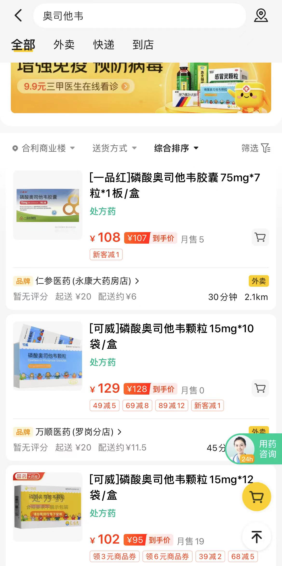 在电商平台,仍有不少不同品牌、剂型的奥司他韦产品在售,但记者对比发现,价格普遍比线下药店贵出不少。在某药店,其在售奥司他韦颗粒售价为128元;另一药店,奥司他韦胶囊为107元;也有价格跌破百元,“到手价”在89~95元区间的,但“预计要后天送达”或是“1~3天送达”。