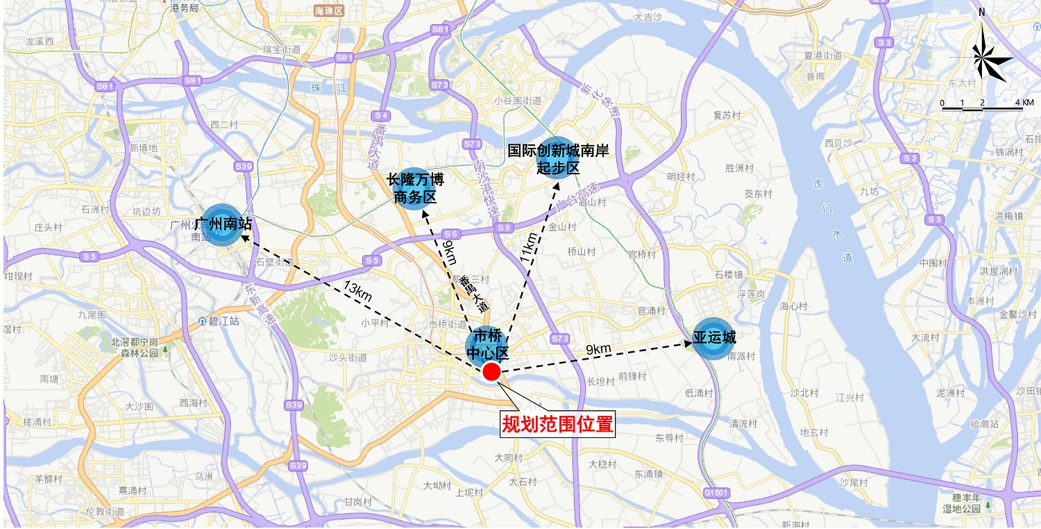 该地块位置优越,临近市桥中心区,西距广州南站约13公里,北距番禺区政府约500米、长隆万博商务区约9公里、国际创新城南岸起步区约11公里,东距亚运城约9公里。番禺广场地铁站位于规划范围西北侧,为3号线、18号线、22号线、3号线东延线(在建) 换乘站。