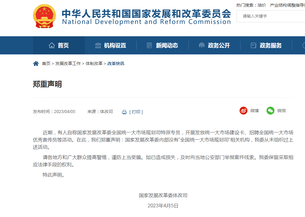 国家发改委网站4月5日发布郑重声明:
