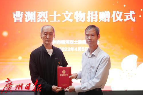 2023年4月5日,曹渊烈士后人(左)向银河烈士陵园捐赠文物。