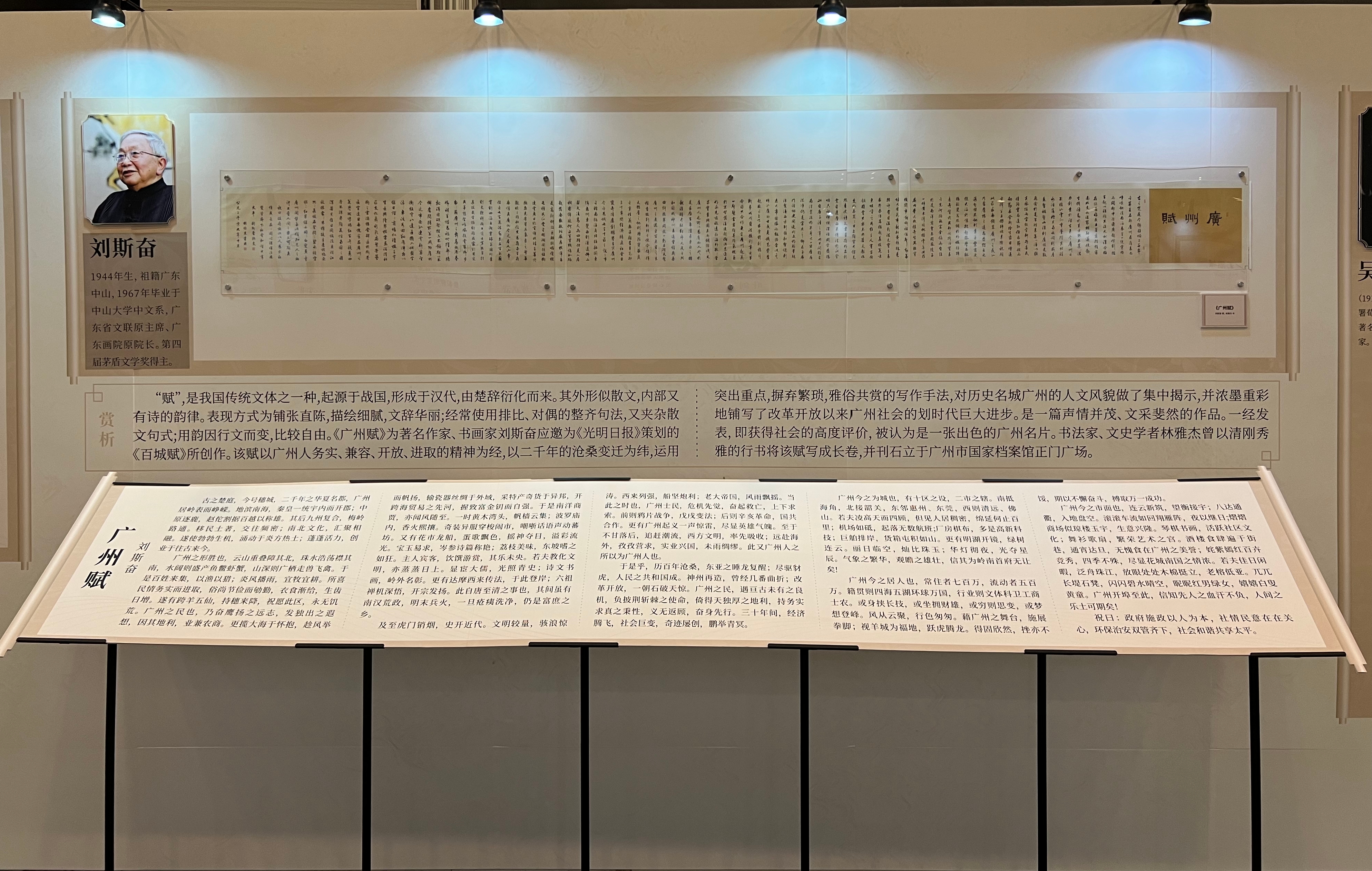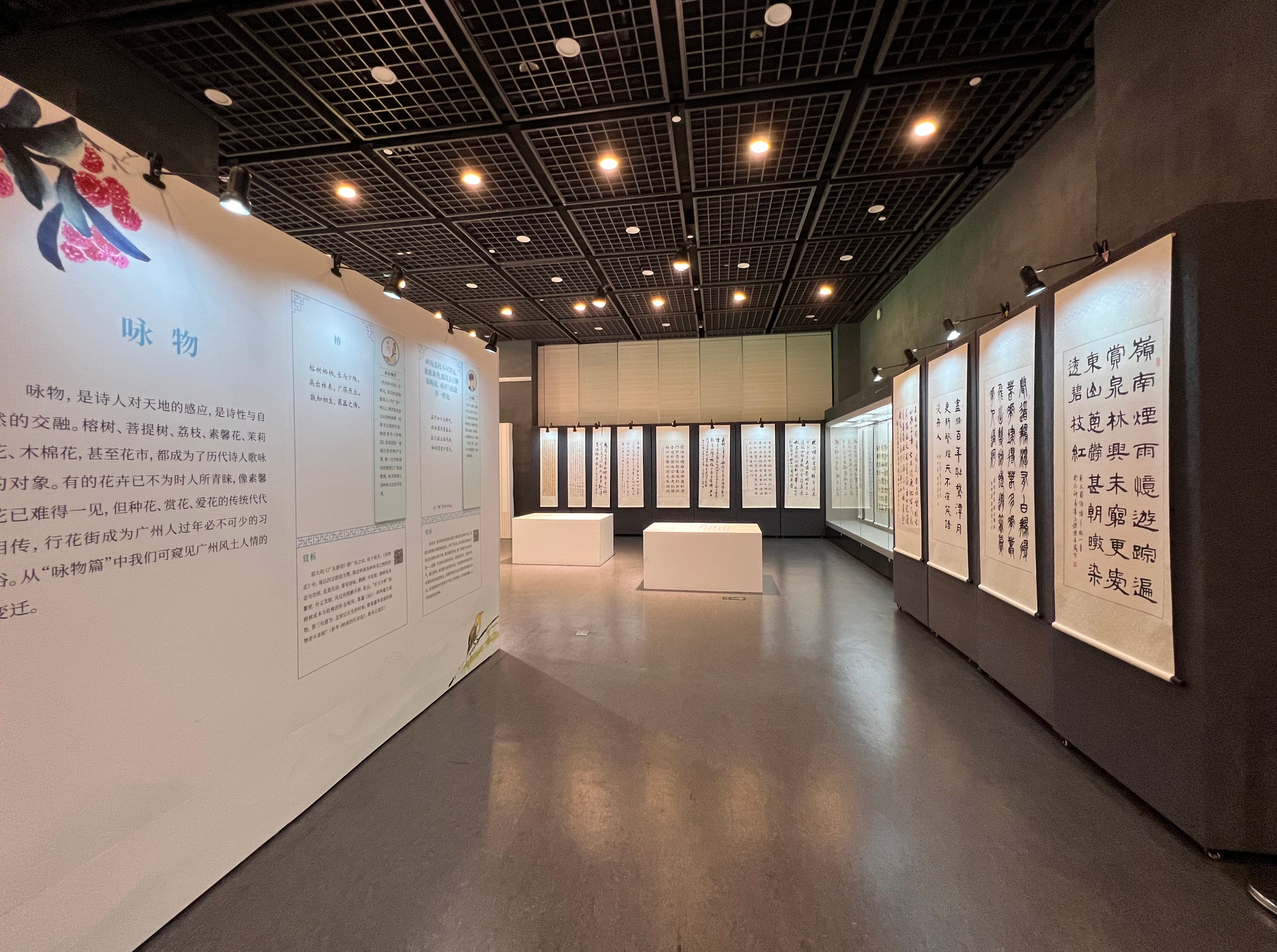 行旅篇中名胜部分以越秀山、白云山和珠江为主线,以越王台、镇海楼、光孝寺、荔枝湾、浴日亭等20余处诗词景点为依托进行呈现。咏史篇选取了宋代《任嚣城》、明代《广州歌》以及当代《广州赋》《岭南》等名篇,展现了广州历史文化的演变,以及红色文化、岭南文化、海丝文化和创新文化的深厚底蕴。咏物篇选取了有关榕树、菩提树、荔枝、素馨花、茉莉花、木棉花以及花市等有关的诗词,展现了广州人爱花赏花的传统以及风土人情的变迁。为更好地普及诗词文化,本次展览邀请沈汝和、石牛、雍平、陈贺达等专家对展览古诗词进行解读,赵大明、杨芳、梁宇等14位朗诵家对部分诗词进行诵读。