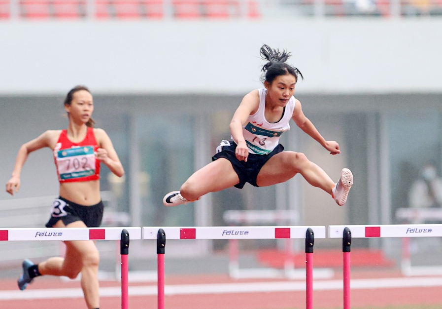 陈梦巧(右)在女子甲组400米栏比赛中。