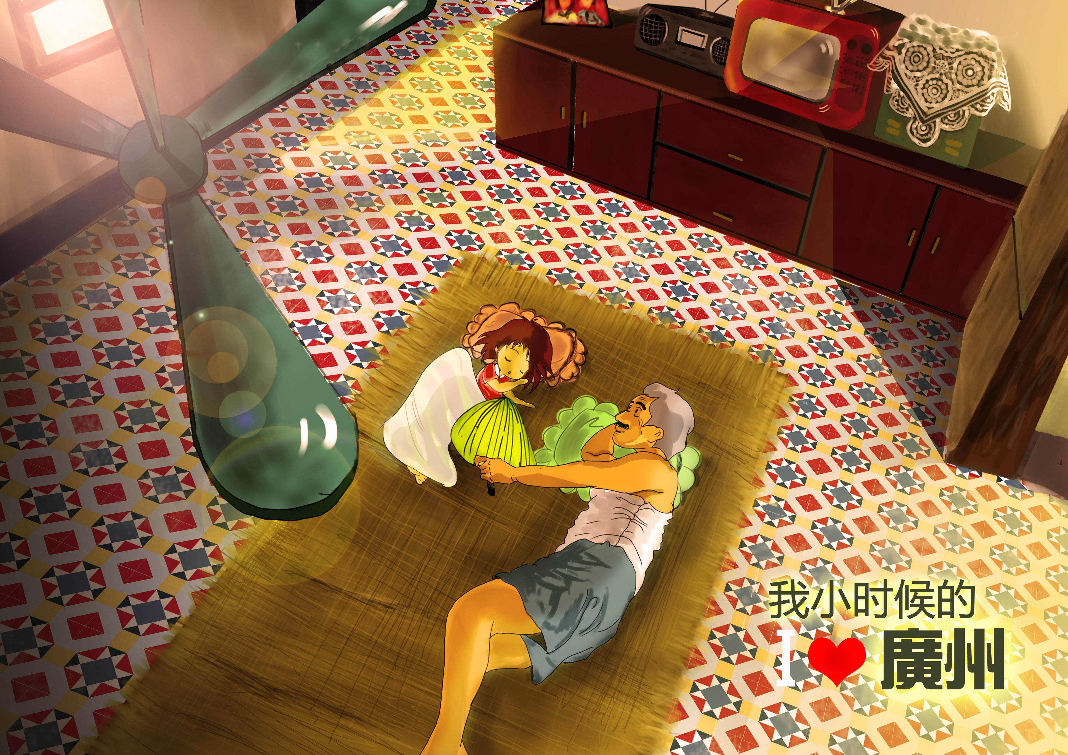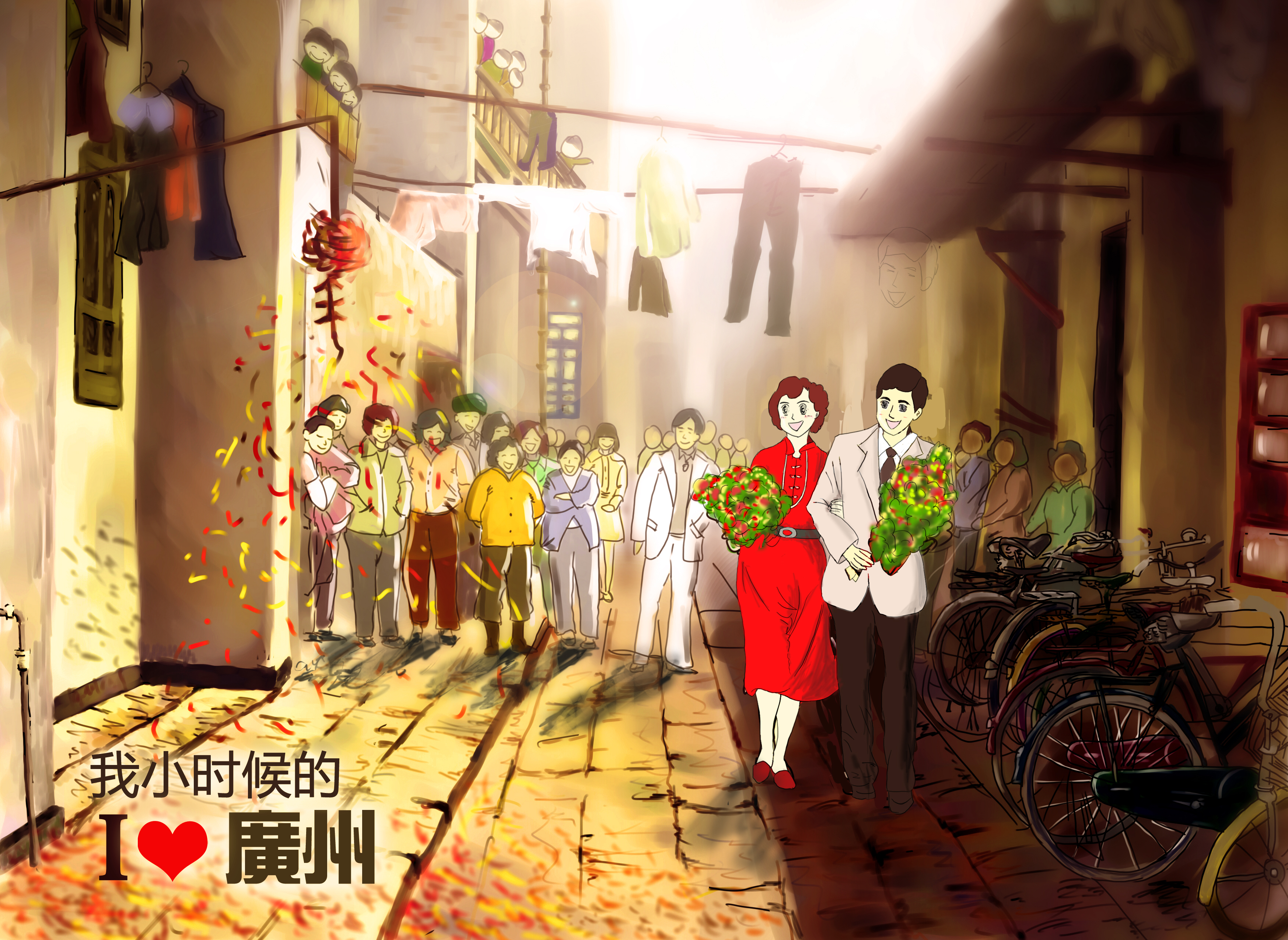 每个生长于广州的人,脑海中都会留下对这座2000多年历史古城的独家印记。龚婷是一位细心收集这些印记的画师。2012年开始,她创作了数十幅“小时候的广州”主题画作。这些画用十分生活化的场景,描绘了她爷爷奶奶、爸爸妈妈、同辈和儿子四代人儿时的广州:往返河南河北的艇仔、西关的婚礼、老骑楼、老电车、盛夏花街砖上爷爷的草席和蒲扇……这些画面一下让很多广州人的思绪拉回到了童年。