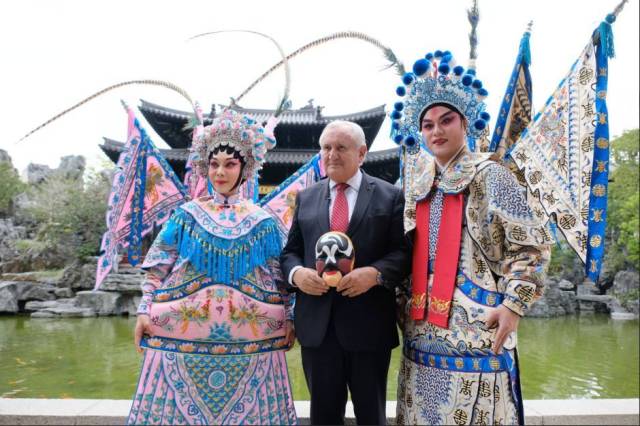 △2018年,拉法兰在粤剧艺术博物馆手持脸谱,与演员合影留念。